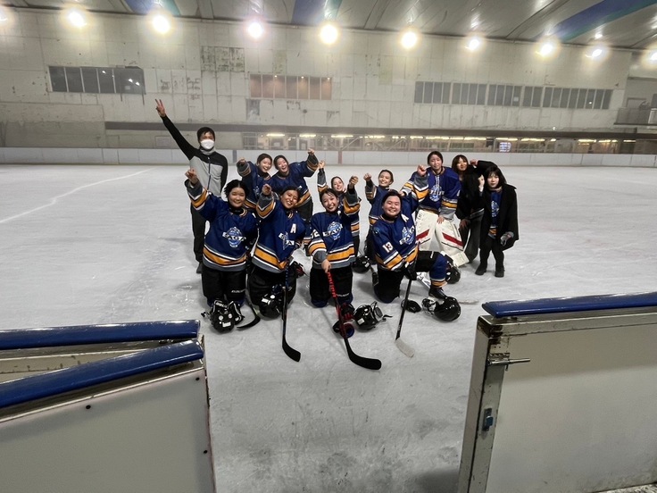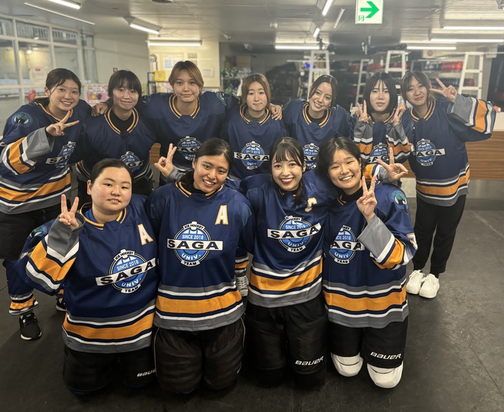 アイスホッケーは、リンクを貸切って行うスポーツのため金銭的な負担がすごく多いスポーツです。また、佐賀県にはスケートリンクが無く、お隣の福岡県にあるスケートリンクまで行き、練習に励んでいます。私たちは先日行われた「第12回日本学生女子アイスホッケー大会予選」で他大学に勝利し、本選に出場することが決定致しました!その他にも過去に多くの大会実績を残しています。