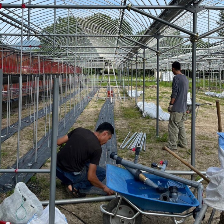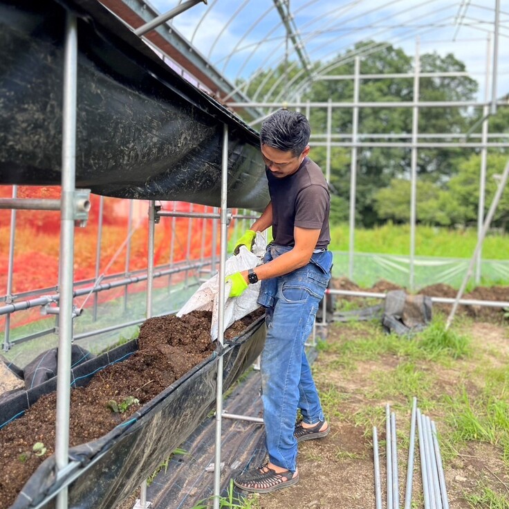 倒壊したいちごのハウスで苗を植えていた土は回収して敷地の一角にブルーシートをかけて保管をしていたのですが、今回はその土を再び使うために運んで、架台に入れていくかなりの力仕事を2時間も手伝ってくれました。