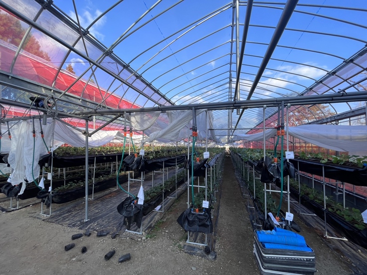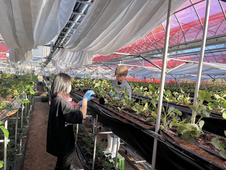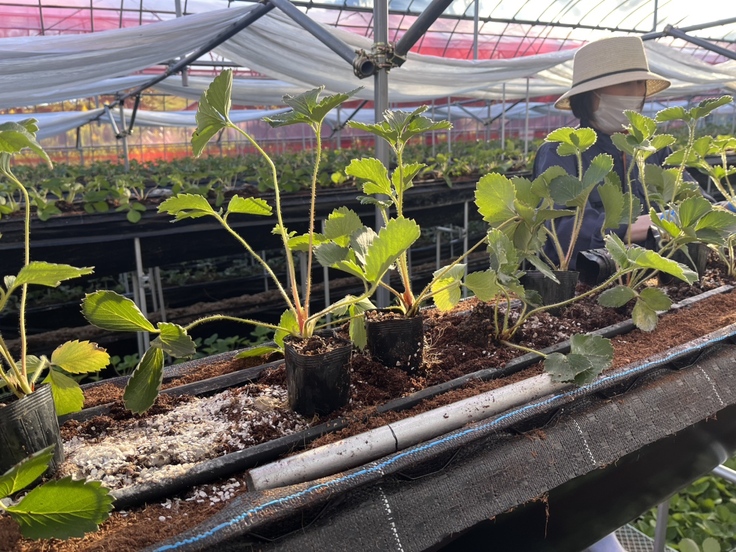 女性陣は一緒に植え付けの作業を行いました。やはり植え付けの時の苗の向きが難しかったようです。株間を均等にするために余ったパイプにマジックで線を引き、即席手作り定規を作ってみました。これがなかなか便利です。