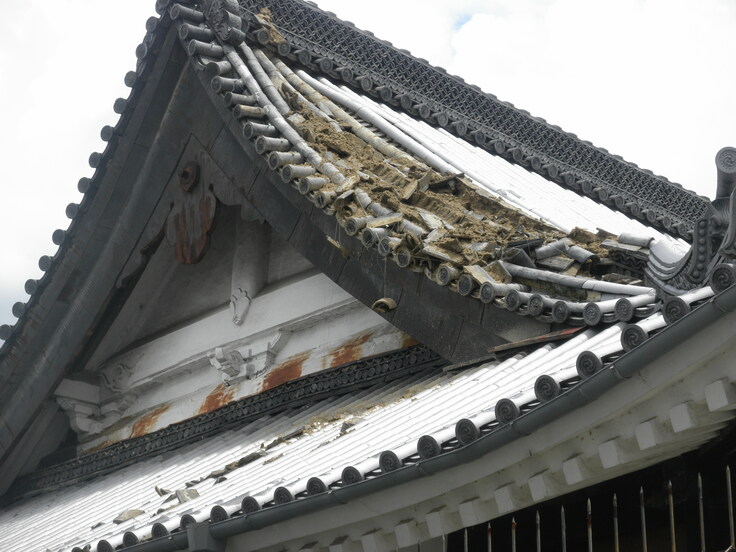▲平成30年の大阪北部地震と西日本大豪雨の影響で崩壊した降り棟(当時)の写真です。現在は4本の降り棟を復旧せずに取り外すという応急処置を施しています。