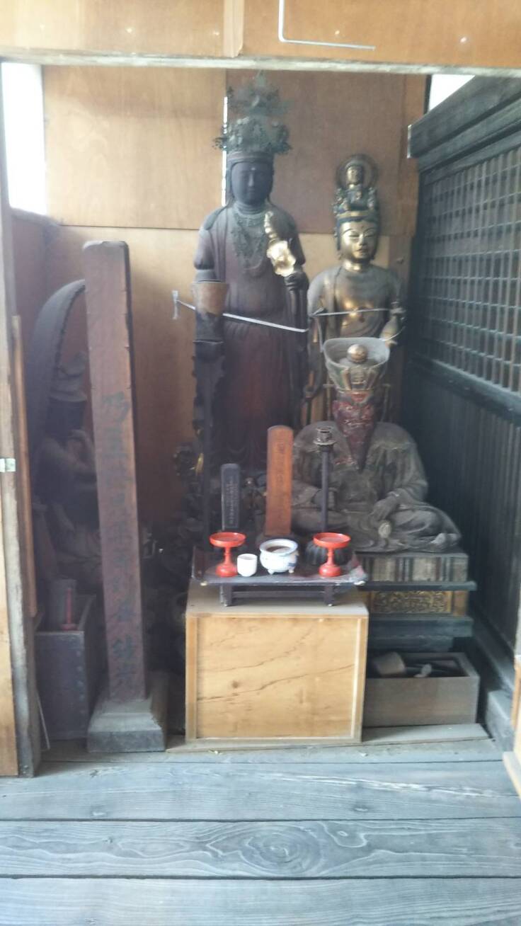 ▲阪神淡路大震災で「観音堂」「祖師堂(十王堂)」が全壊し、本堂濡れ縁片隅に仮安置されている仏様です。今回の改修では、これらの仏様を堂内できちんとお祀りできるようにいたします。