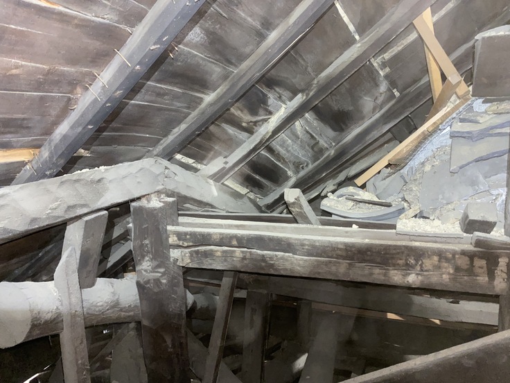 ▲本堂屋根裏。近年の応急処置の形跡が見受けられますが、母屋が折損し、野地板が変形したままになっています。また、何故か小屋裏に昔の瓦が残されてしまっています…。