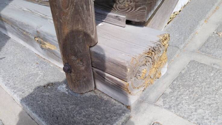 ▲本堂正面階の部分にはシロアリの蟻害が進んでおり、一刻も早く手を入れなければならない状況となっています。