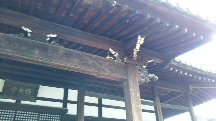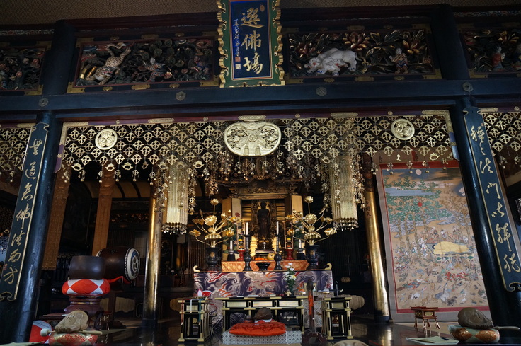 ▲こちらは本堂の内部、荘厳の様子です。御本尊は阿弥陀如来。明治24年に安阿弥(快慶)作との鑑定結果が報告されています。向かって右の方に掛けてあるのは池田市最大級の涅槃図で、約400年前に作成されたものです。外陣内陣至る所に羅網が飾られ、地方都市の一般寺院としてはかなり豪華絢爛な荘厳となっていますが、経年劣化が随分と進んでいます。