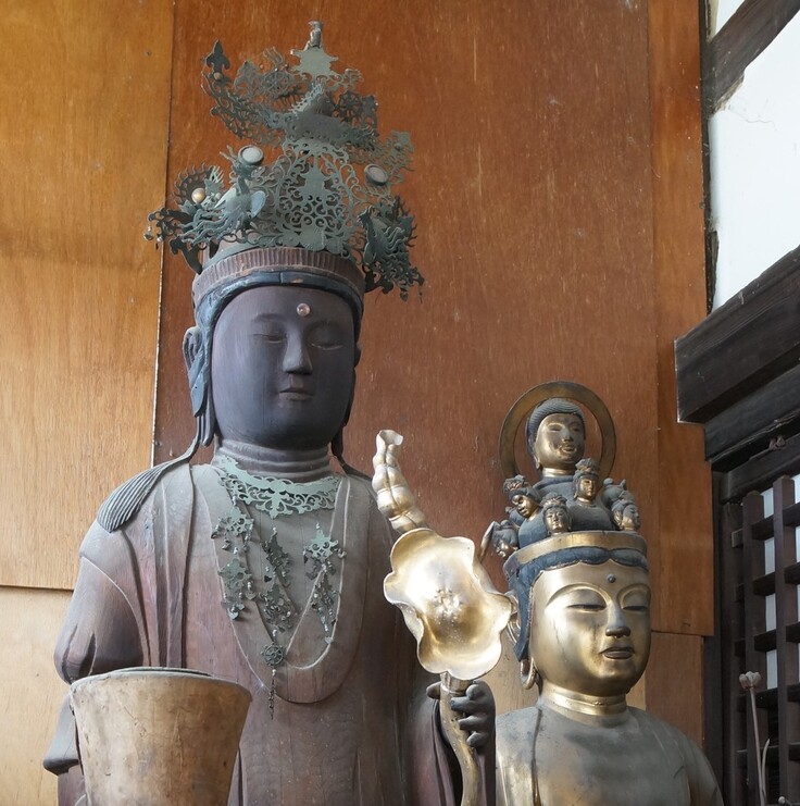 ▲創建当時、止々呂美から祐圓上人を慕って西光寺に来られたという伝説の観音様。実は向かって左は梵天様ですが、昔から”観音様”として親しまれてきたようです。平安期の小野篁作との鑑定記録(明治24年九鬼隆一氏らの鑑定団による)があります。