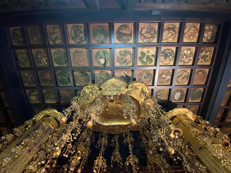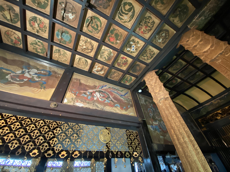 ▲内陣の格天井には一枚一枚、300枚以上もの天上絵が張られています。壁には天女や四天王が描かれています。天蓋や幢幡も随分と立派な作りです。