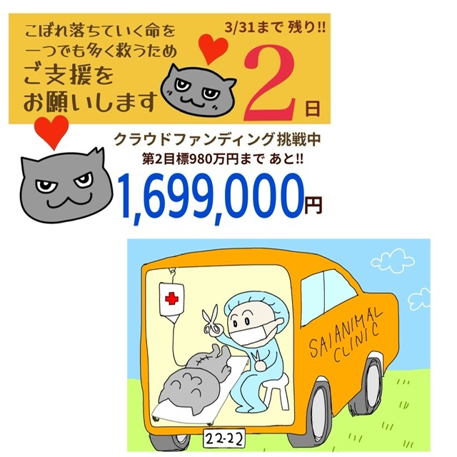 現在挑戦中のクラウドファンディング「こぼれ落ちていく命を1つでも多く救う」もあと残り2日で終了となります。