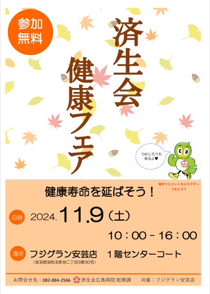 済生会健康フェアを、令和6年11月9日(土)にフジグラン安芸店を会場として開催いたします。今回は「健康寿命を延ばそう!」をテーマとして、認知症についての講演会や健康チェックなどの各種イベントを開催いたします。