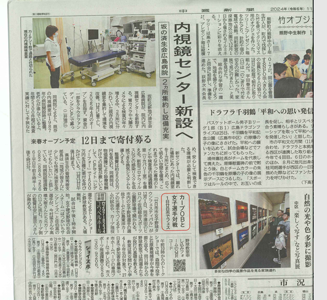 クラウドファンディングへの応援いつもありがとうございます。本日(11/26)付けの中国新聞に、内視鏡センター新設とクラウドファンディング募集の記事が掲載されました。中国新聞は、県内で約47万部(2024.10.15現在)が読まれている地元に密着した新聞です。この記事により、より遠くの皆さまへご支援を呼び掛ける声が届けば良いなと職員一同願っています。