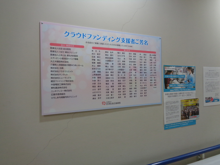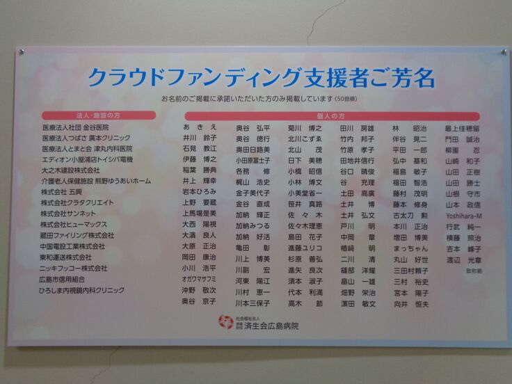 本日より、内視鏡センター設立のためのクラウドファンディングへご協力いただいた方々のお名前を記した『ご芳名板の設置・病院ホームページへの掲載』を開始いたします。