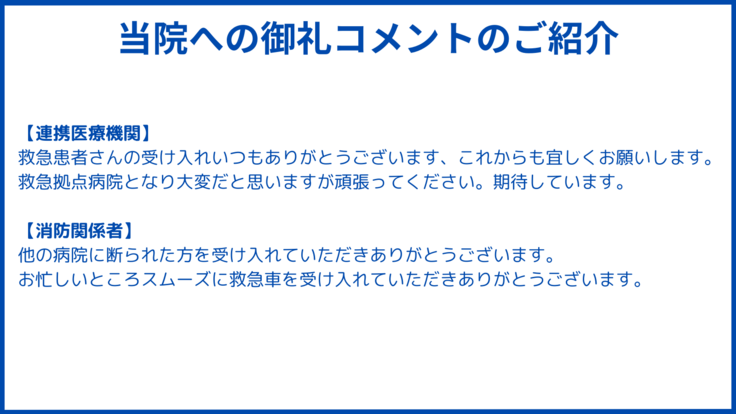 大変ありがたいことに搬送を担当する消防の方や連携医療機関の先生方、そして多くの患者さんから、温かいお言葉をいただいてまいりました。