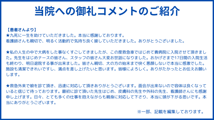 引き続き、当院の取組みに対して、温かいご理解を賜りますようよろしくお願い申し上げます。