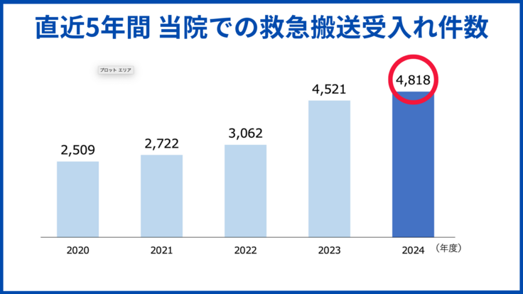 新たな救急拠点のイメージは、「ER・断らない救急、重症者対応」、「年間救急車受入れ数は8,000台以上」であり、私たちにとっては非常に大きな挑戦です。しかし、「地域の医療を支えるんだ」という、断固たる「覚悟」が、私たちにはあります。職員一丸となって取り組みを進めたことで、当院における救急車の受入れ台数は飛躍的に増加し、2022年度に3,062台だった救急車の受入れ台数は、2024年度には約1.5倍の4,818台へと増加しました。