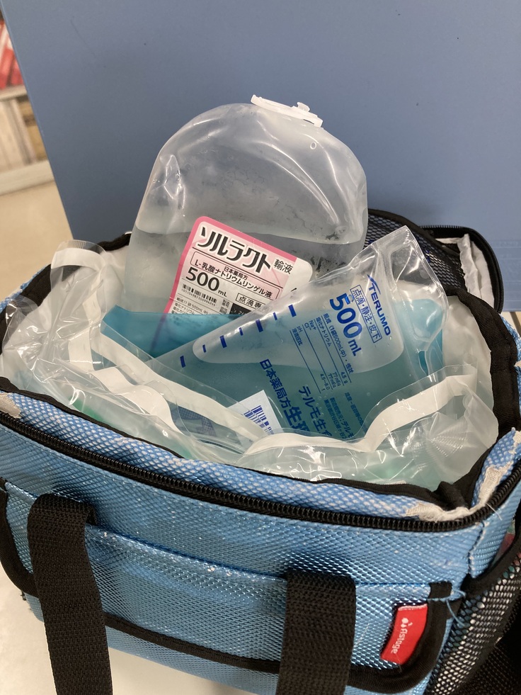 夏期、熱中症等で脱水の症例も多く暑い日の出動には、冷やした輸液製剤を保冷バックに入れて準備していきます。