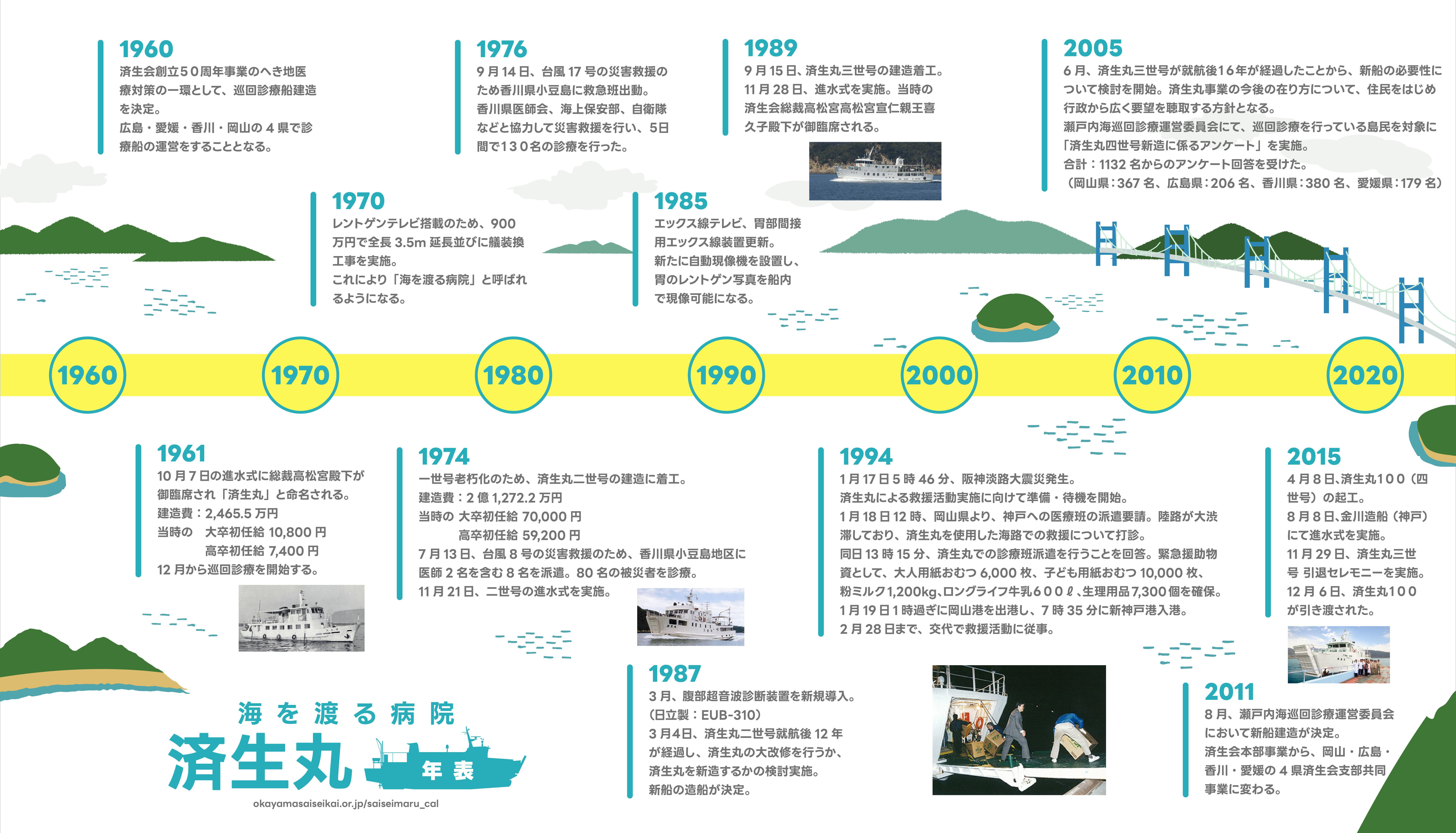 済生丸は、これまで半世紀を超える長きにわたり、瀬戸内海の約60の島々を巡回し、島嶼(とうしょ)部の方々の診療・検診を行い「海をわたる病院」として親しまれてきました。これまでの総航走距離は918,883.66㎞(地球約23周分)、受診延人員は627,441人にもおよびます。