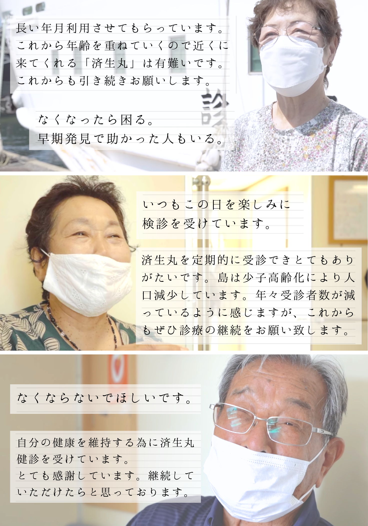 そうした中で、済生丸の検診で早期のがんが発見され、早期治療へつながり、今も島で元気に暮らしている島民の方も少なくありません。