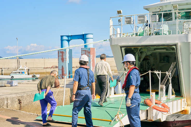 乗組員は受診者様の安全通路等の確保目的で船の舷門にて乗下船のご案内やアテンドをしています。その際に世間話などで何か気を休めてもらえればとの思いで島の方々へ話しかけ、人生の大先輩から島をはじめとした地域等の変遷話しを伺い、生き生きされている姿を見て、予防医学の重要性を感じております。