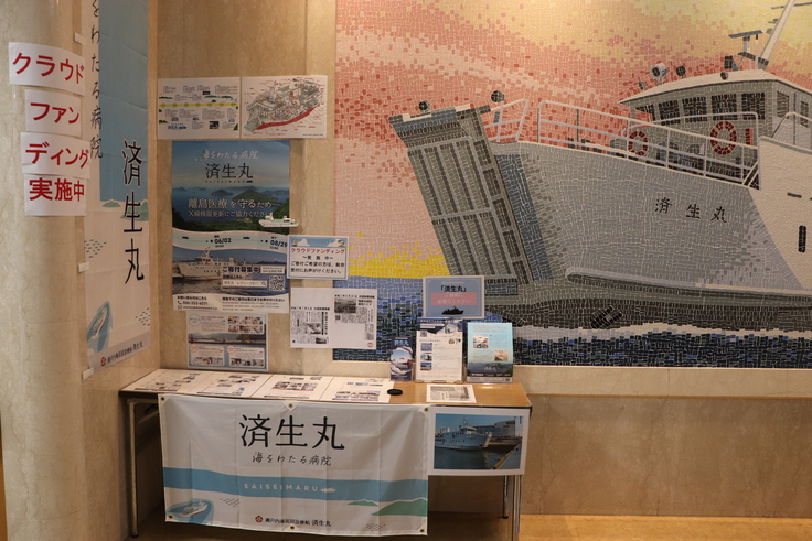 香川県済生会病院1階エレベーター前には、済生丸の壁画がありその前でブースを設置しています。