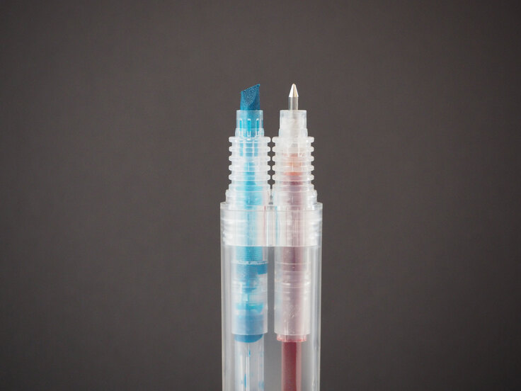チェックペンやマーカーは、ペン本体にインクを含ませた中綿を内蔵しペン先に接触させる「中綿式」が主流です。インクを最後まで使い切ることができず、内部の毛細管力が弱まると書きづらく疲れやすい特徴があります。