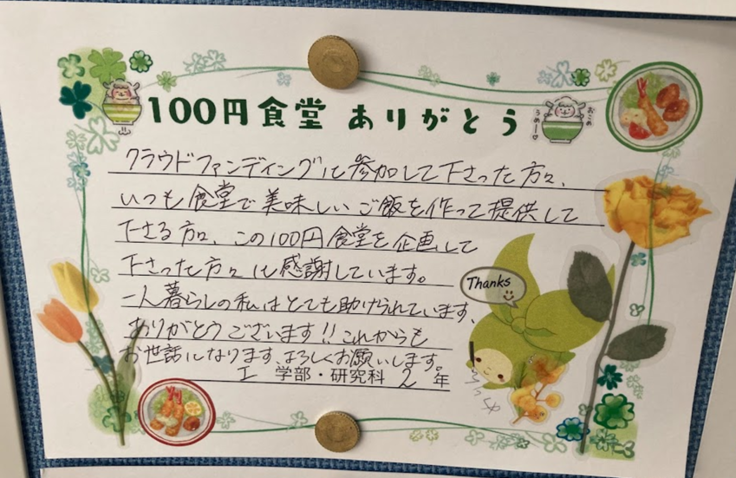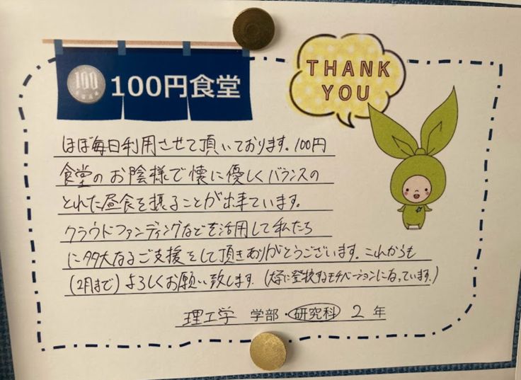 食費が安く済むので助かっているというたくさんの感謝の声に続いて、大学に来るモチベーションとなっているという声、100円食堂のお陰で友人との時間が増えたという声も届いています!
