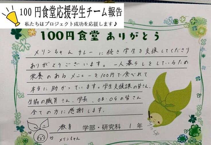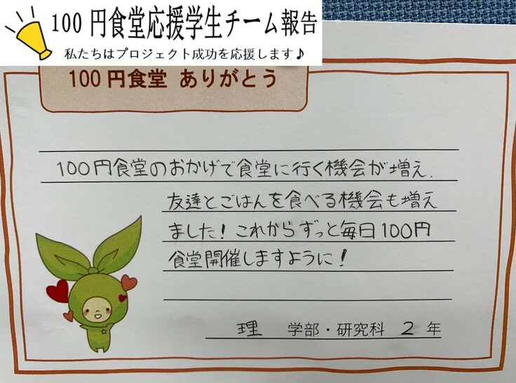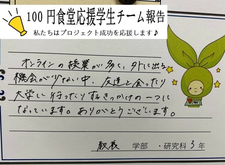以下、100円食堂を利用した学生からの「感謝のメッセージ」をいくつか紹介いたします。(100円食堂応援チーム K)