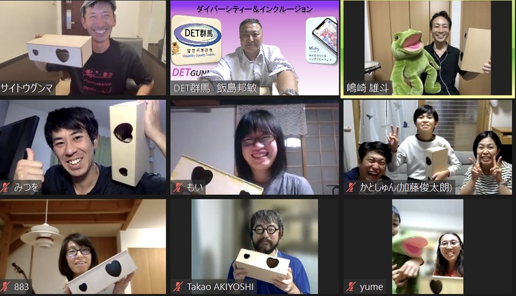 Zoom担当スタッフのDET群馬代表の飯島さんが、技術面をサポートしてくださり大変うまくいきました。私は、DET群馬の障害平等研修のサポーターしてます。きっかけは、「バリアフリーってなんだろうか?きちんと学びたい。私はバリアフリーなカホンを発明したと言ったが障害とは何かきちんと説明もできない。」という理由で数年前に受講した事でした。今度は、私がサポートしていただきました(笑)