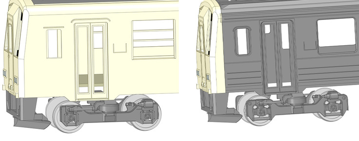 今回は、台車の最新画像をご紹介します。以前、本形式は、特殊な軸距の関係で、量産市販品が出ていない(のでは?)と申し上げましたが、今回仰天したのは、一次車と二次車の台車の形状が異なるという事実!!(これ、皆さん、知っているものなのですか? 僕は全然知りませんでした!)
