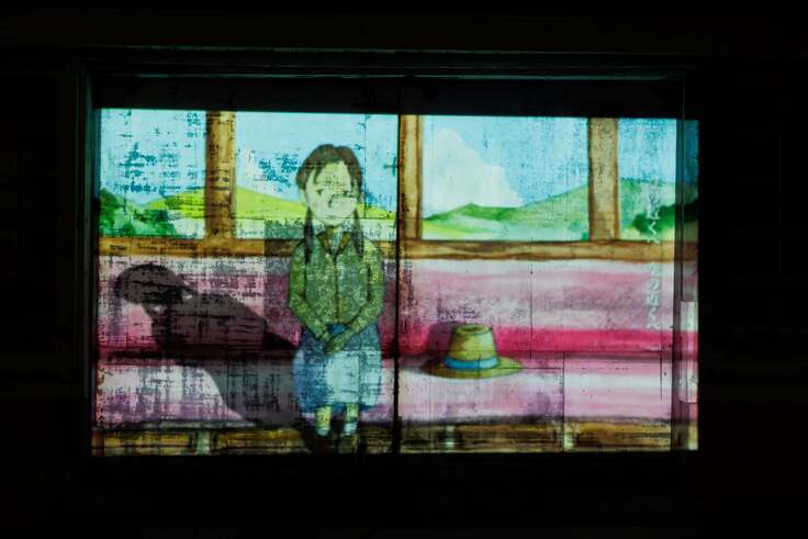 2023年 司牡丹ビン詰め工場に投影(作家:葛目結)