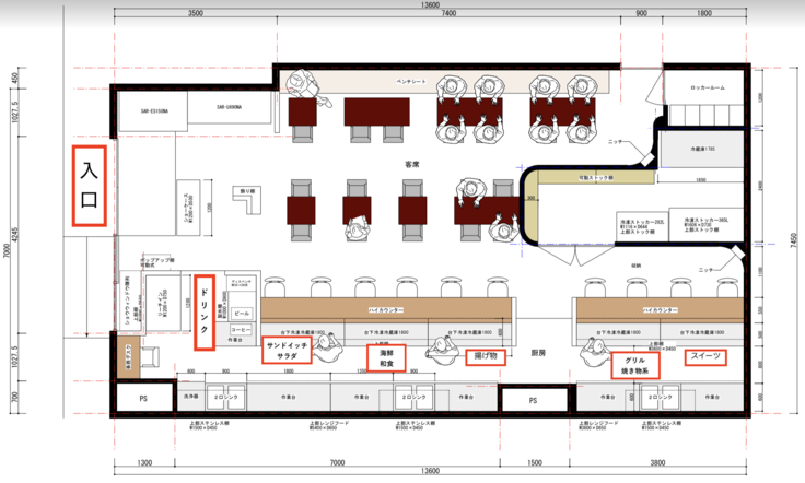 『SAKIGAKE』は一つの飲食店に5つのミニキッチンスペースを持ち、共通の飲食スペース(36席)とストックスペース、テイクアウト、デリバリーの受付、提供スペースとサービススタッフを配置します。
