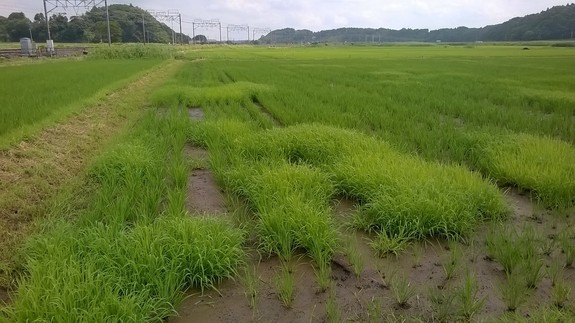 この写真のこんもりとやや明るくなっている部分はヒエに覆われてしまった部分です。ヒエに覆われると、どんどん肥料分がヒエに取られてしまい、収量ががた落ち。
