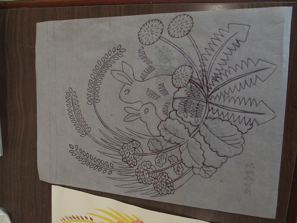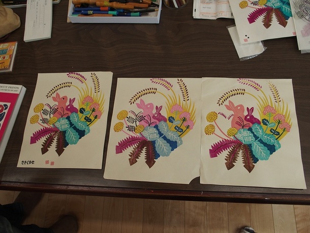服:私達の場合には下書きを書いて、それをトレーシングペーパーに書き写して、反対の面をカーボン紙で版木に写して、それを彫って、なんどか刷ってみてって感じかな。