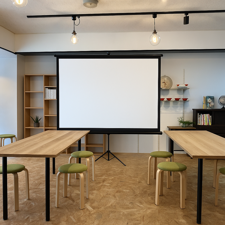 「さくのす」にプロジェクター、スクリーン、スピーカーを設置し、月に2回ほどの映画上映会を開催します。