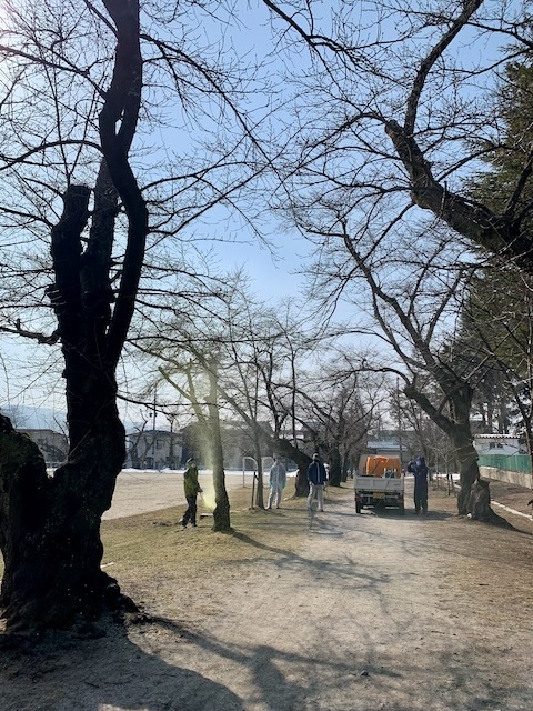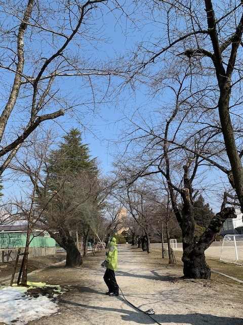 三月の快晴の休日に毎年恒例となっている桜の消毒作業を行いました!