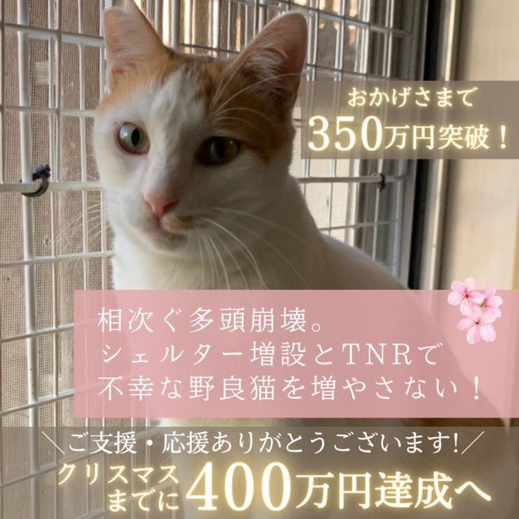 本プロジェクトはAll or Noting方式で第一目標が達成できなければ全額返金となる覚悟の挑戦です。猫たちの環境を変えていくため、第一目標はもちろんのこと、最終目標達成に向けて、「Xmasまでに400万円」を目指しています…!🎄🎁
