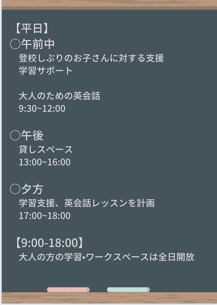 中学校教諭、インターナショナルスクール教員を経て、起業を決意。 4年間の教員生活の中で、さまざまな子どもたちと触れあってきました。そこで感じたこと。 それは 「もっともっと子どもたちの居場所を増やしたい。」 学校だけではなく、学校とは違った安心して 過ごせる場所をつくりたいと思います。 もろろん大人のも安心して仕事ができたり 交流できたりする場所が必要です。 ワーキングスペース、個別学習スペースを設けることも計画しています。