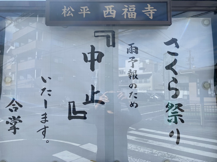 出演ステージも本堂前で雨が降るとブラスバンド・太鼓・ピアノが濡れてしまい壊れてしまうこと、境内の飲食スペースが雨ざらしになってしまい、飲食の場が提供できないこと、自転車で来ることが難しくなる等々、来場者数が激減し飲食店の負担などをふまえ、今回は『中止』とさせて頂きました。