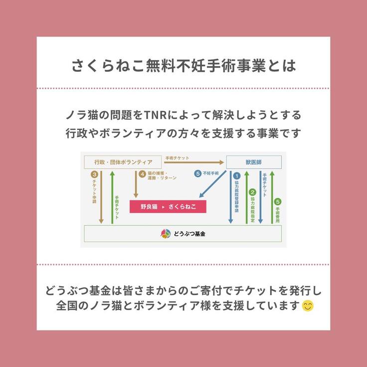 どうぶつ基金は皆さまからいただいたご寄付で、協力病院において無料で不妊手術を受けさせることができる「さくらねこTNR無料不妊手術チケット」を発行し、ノラ猫問題を解決しようと頑張っている全国の行政やボランティアの皆さまを支援しています
