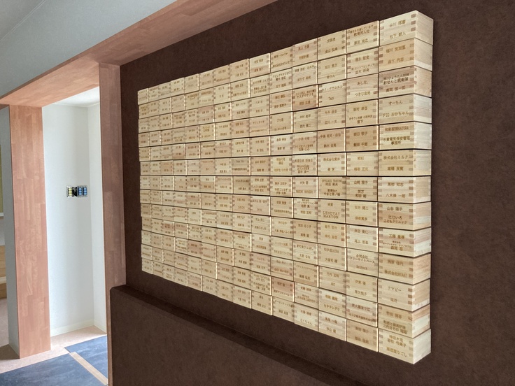 新社屋のオフィスには、皆様お一人お一人の名前が刻み込まれた「大垣名産の枡」がいつも見えるところにございます。すでに私たちにとって、お守りのような存在になっています。