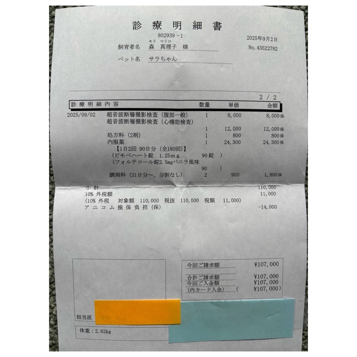 アニコム保険に加入しており、治療費の一部が保証される予定です