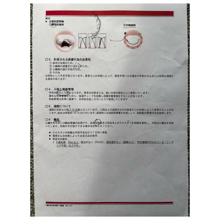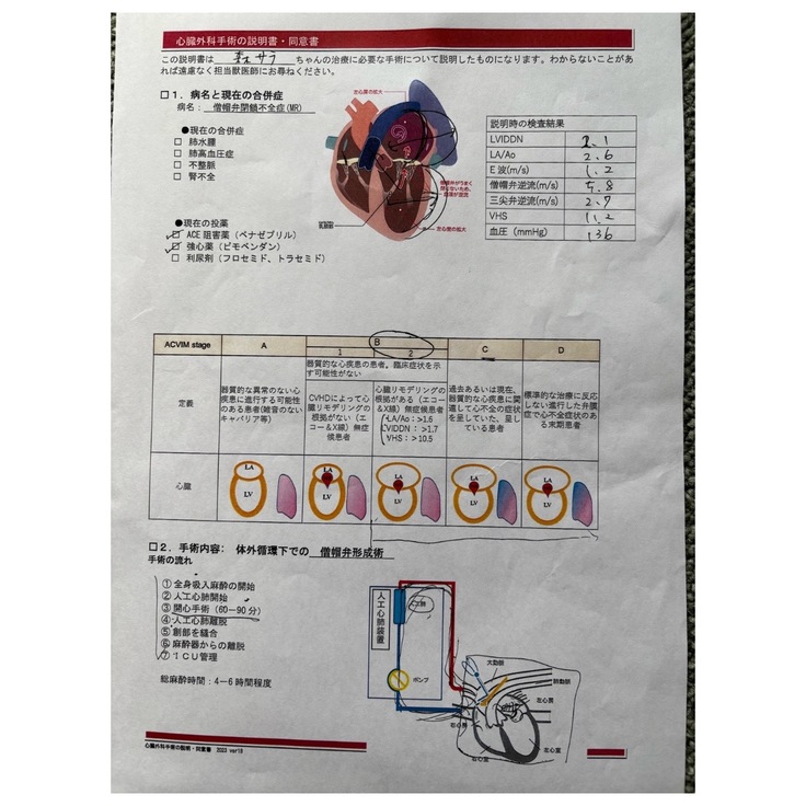 僧帽弁がきちんと閉じず血液の逆流は認められるが、半年後の経過観察で良いと診断されましたがお散歩・ボール投げ、おもちゃ遊び過激に吠えたり、興奮する様な事はしない様にサラの生活に制限しなくてはいけない事が始まり、今年の7月の経過観察検診を受けた際、もうB2レベルで心臓肥大も有り進行がかなり早く、このまま進行すると肺水腫や心不全を引き起こし、命に関わりすぐに薬の投薬と早い手術を進められ命を守るには「心臓外科手術」しかないと医師に告げられました。