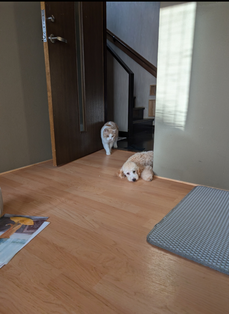 行って直ぐはワンちゃんに猫パンチしてましたが今は横を通っても知らん顔