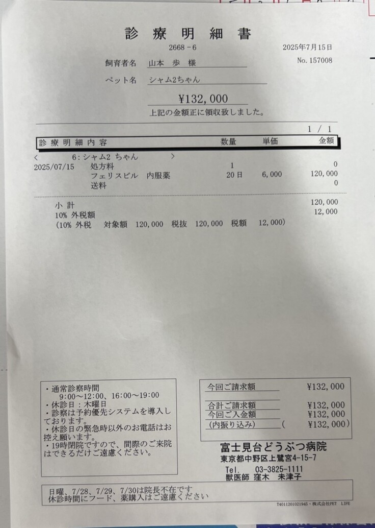 ここ最近では人間のコロナのお薬(モルヌピラビル)で10万円程で治ると言われてますが、84日間飲ませたら治っていると思っておられる病院が多く再発されてる事も耳にしています。