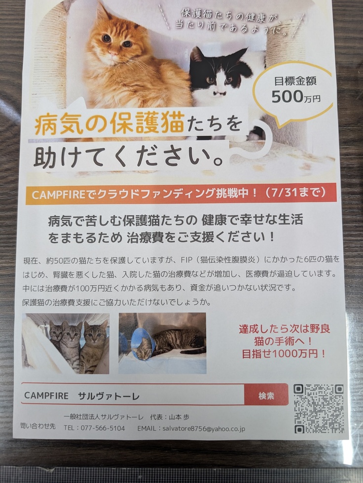 厚かましいお願いでございますが、現在も50頭程の保護猫を抱えており、去年8月〜現在にかけて、FIP(猫伝染性腹膜炎)を6頭が発症し400万以上の費用が掛かってます。数年前までは不治の病とされ、近年では中国からの輸入薬で治せるようになりました。