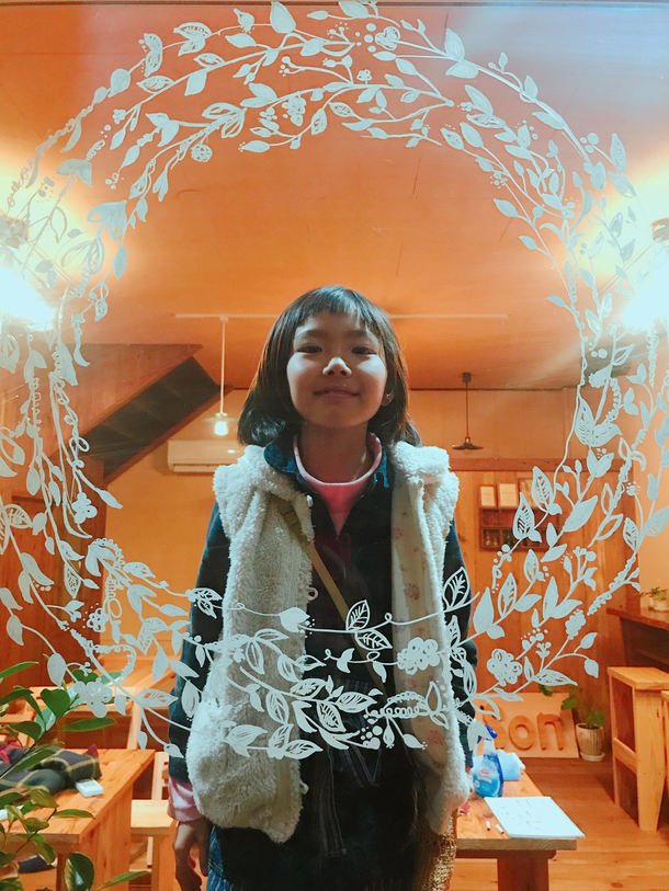 この子、改修後のSampSonに来るのは初めてだったようで終始キョロキョロしていたのが面白かったです。丁度窓に植物のフレームをペイントしている最中だったのでいたずら心で「そこから顔出してみて~」と注文したら可愛い結果となりました。
