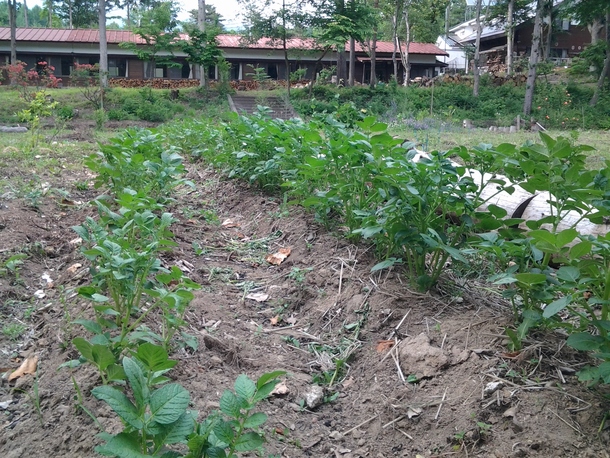 先月植えたジャガイモがずいぶん大きくなってきたので、「芽かき」を行いました。元気な茎を残して、他の茎は抜いてしまいます。なんだか可哀相な気もしますが、「芽かき」はジャガイモを育てるのに必要な作業で、これをしないとジャガイモが大きく育ちません。まだ慣れませんが、地元の農業人に教えていただきながら、畑作業を進めています。