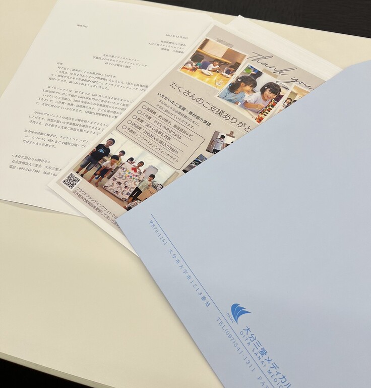 中には、当院オリジナルグッズ(ランダムでどれか1つ)とチラシ(今後の活動について、ご支援いただいた資金の使用用途など)が入っております。