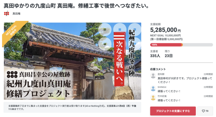 最終日の1月8日23時まで!真田庵修繕の充実という「次なる戦い」のために、どうか変わらぬご支援と応援を賜りますよう、何卒よろしくお願い申し上げます。