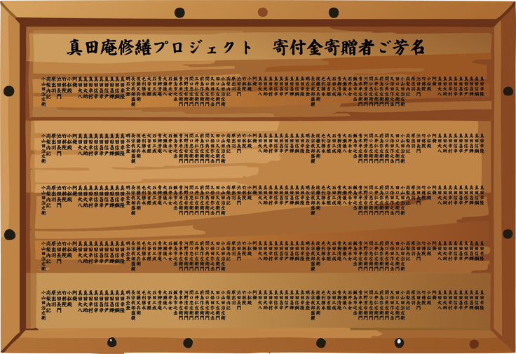 真田屋敷跡は、土地も建物も和歌山県の文化財に指定されていて、案内板であっても県に申請をしなければなりません。そこで、修繕工事が終了しましたら長屋門に固定をせず設置する方向で考えています。できるだけ修繕費用に充てたいので自作となりますこと、ご理解戴けますと幸いです。