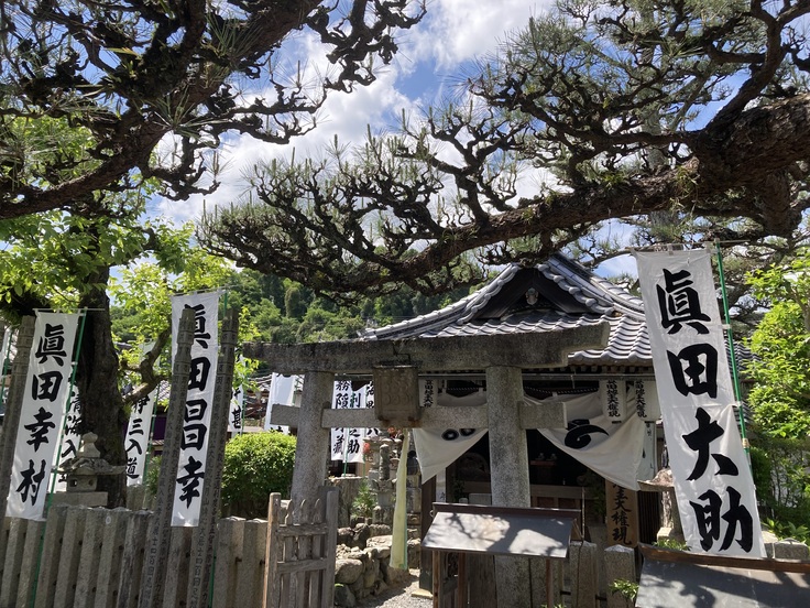 昨日、真田庵に行くと真田まつりの準備が行われ活気で溢れていました。真田十勇士ののぼりも立ち、門には六文銭と結雁金紋の幕が!