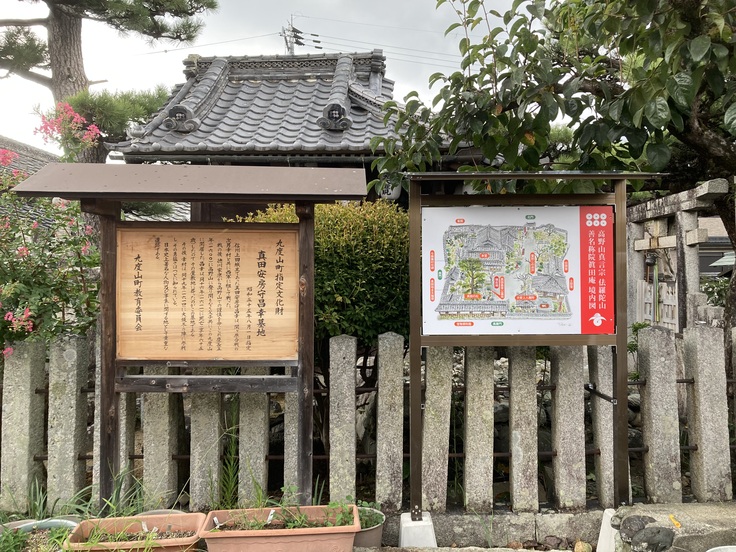 新たな案内板では、本堂のほか、大安上人廟所、土砂堂、位牌堂、長屋門、北門などの建造物、そして真田昌幸公の墓所の位置などを一目でご確認いただけるようになっております。
